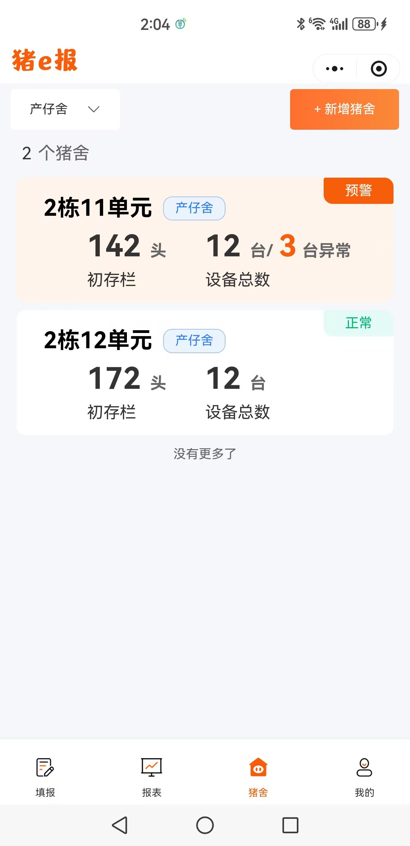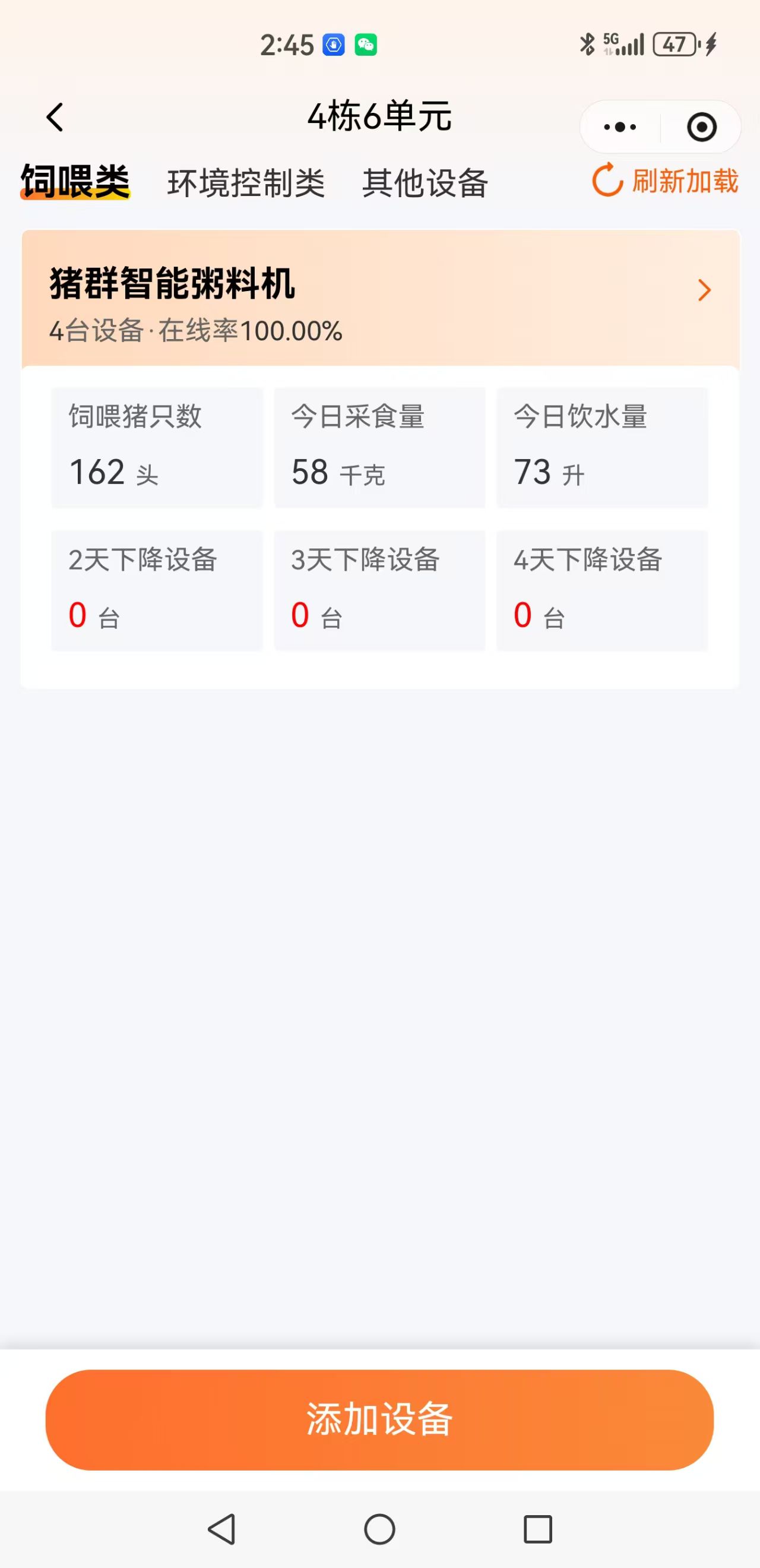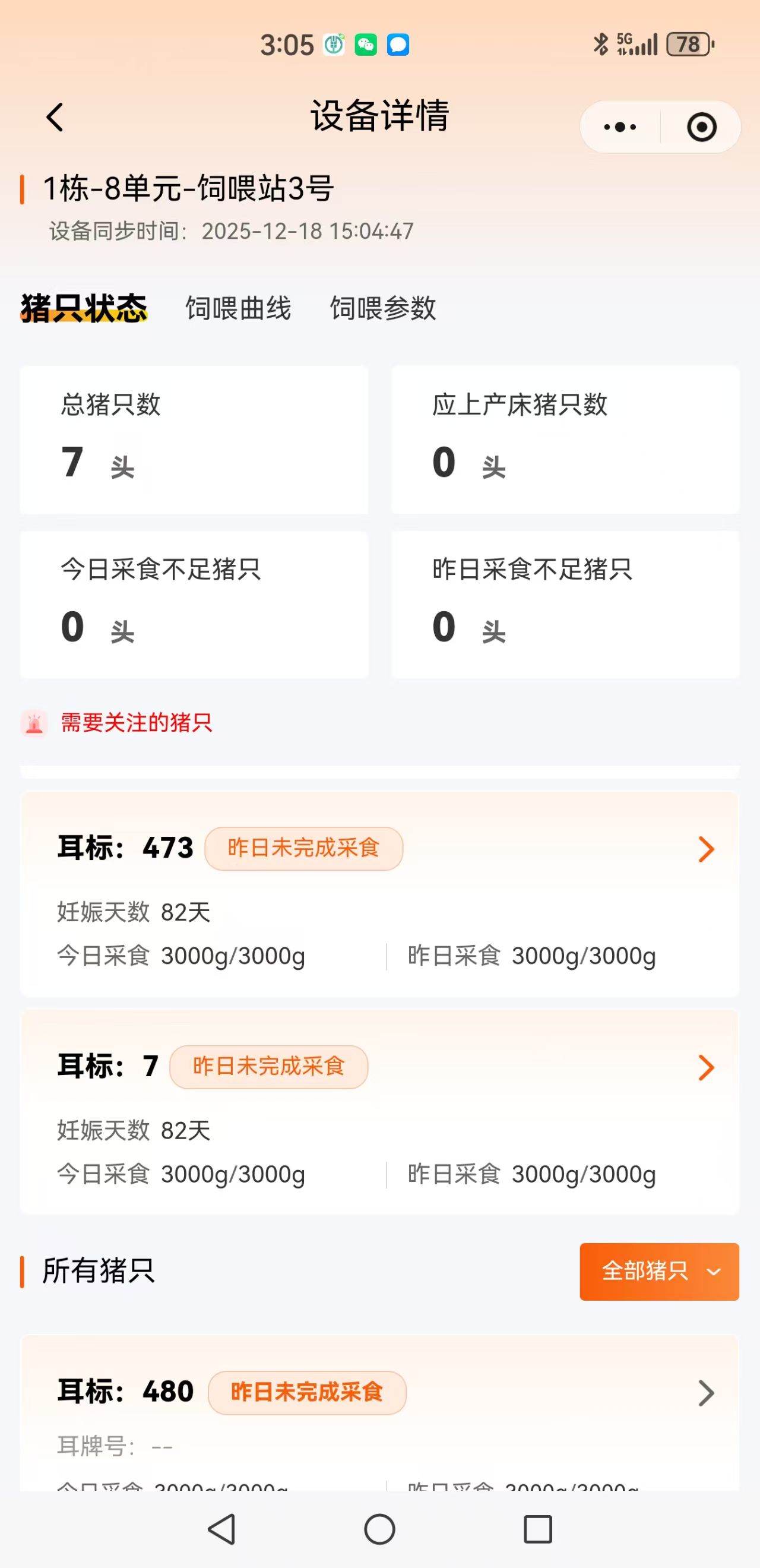 物联网平台自动记录每一头限位栏上、妊娠群养舍、产床上母猪个体采食量,自动记录保育舍、育肥舍猪群每圈采食量,对采食不足猪发出疾病报警并定位。用户可用手机远查看: